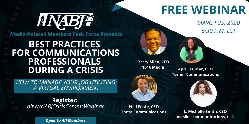 We will continue to do the things that we can control, such as holding additional webinars to assist you during this time (see below for upcoming opportunities). Please continue to refer people to our website and social media portals that have official NABJ information designed to help you navigate through the crisis and keep you up-to-date about NABJ happenings.